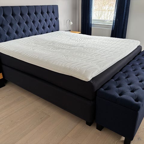 Säljer vår gästsäng från Mio kontinentalsäng i grå textil. Sängen har en hög, vadderad och knapptuftad gavl samt tygklädda underdelar. Ben i metall ger stabilt stöd och underlättar städning under sängen. Överdel med vit bäddmadrass eller madrasskydd. Passar som dubbelsäng i sovrum.