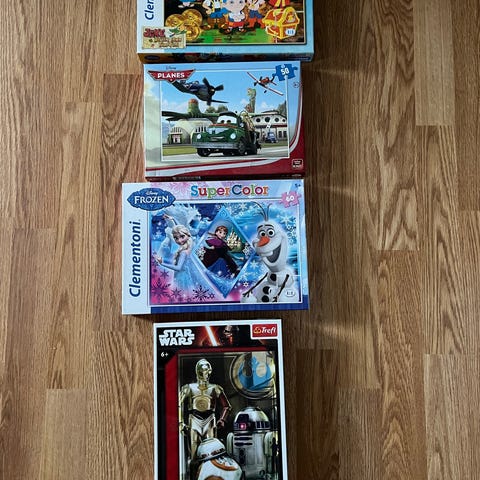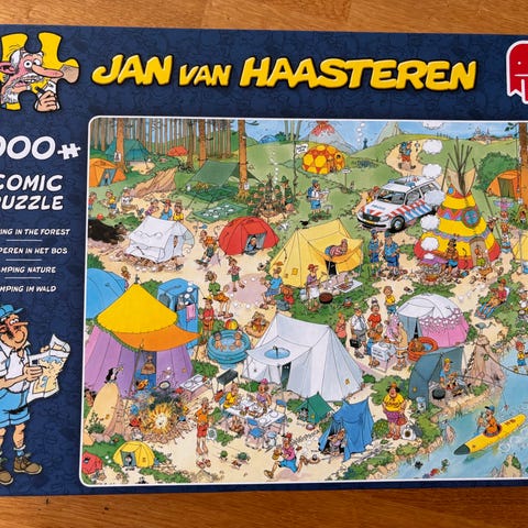 Pussel med blandade motiv från Jan van Haasteren (JvH), Ravensburger och Cobble Hill.