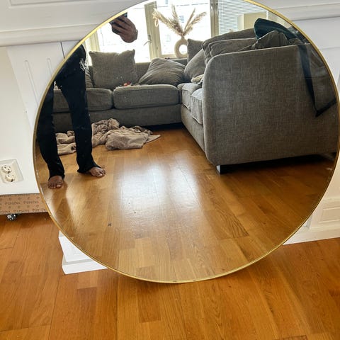 • Rund spegel med mässingsfärgad ram. Diameter 50 cm, ramens djup 3 cm. Fint skick.