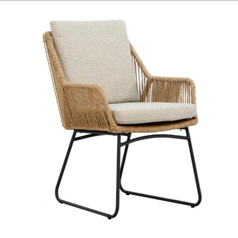 Stolarna har hög rygg och armstöd samt en vävd rottingstruktur i plastmaterial som är anpassat för utomhusbruk.