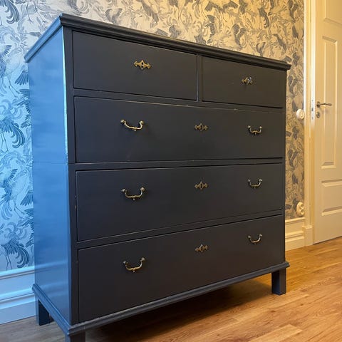 Byrå målad i matt svart färg. Ålder okänd för mig. Köptes nyrenoverad, då även nya beslag.
