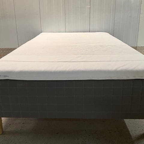 Hilding säng med sänggavel i grått tyg. Sängen står på mörka ben och har en enkel, rak gavel. På bilderna syns en vit bäddmadrass/övermadrass ovanpå sängen. Passar som vanlig säng i sovrum eller gästrum. Exakt modell, mått och material är inte angivna.