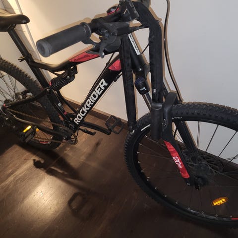 Rockrider ST900 mountainbike för barn. Cykeln är röd med svarta och vita detaljer. Den har framdämpare och skivbromsar. Sadeln är svart och däcken har ett grovt mönster. (passar för ca 6-8 års ålder / 115-125 cm längd)