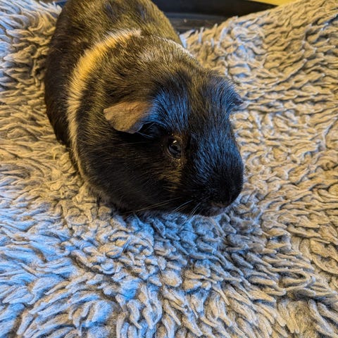 1årig marsvins hona söker nytt hem. Är lite rädd i buren men när hon väl sitter i knät så är hon lugn. Blivit hanterad av vuxna och barn.