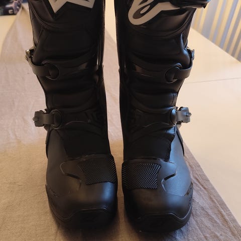 Alpinestars crossstövlar i svart och vitt. Stövlarna har justerbara spännen framtill och förstärkta partier runt fot, häl och skenben. Grovmönstrad sula för bättre grepp.