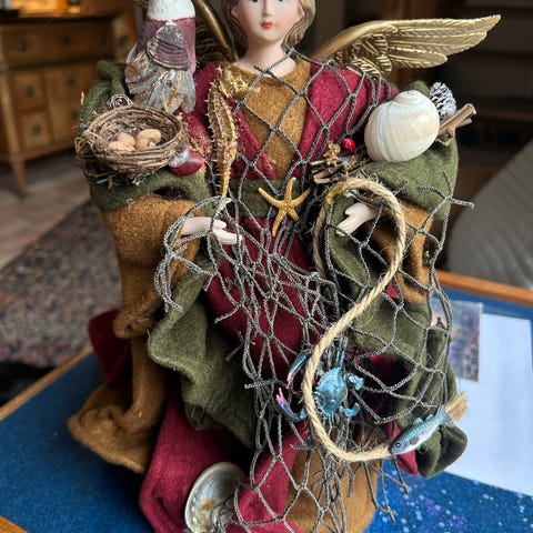 Religiös jesusstaty i pelarformad design. Flerfärgad prydnad med detaljerade dekorationer och blomstermotiv. Passar som inredningsdetalj eller samlarföremål i hemmet eller i ett andaktsrum.