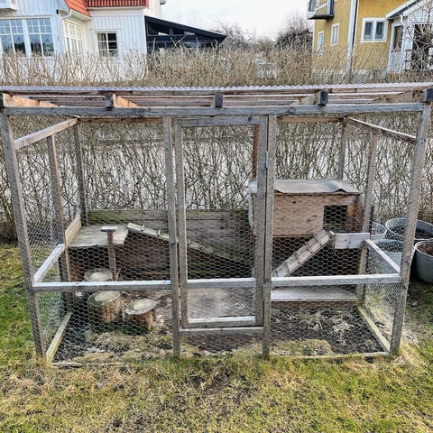 Kanonbur för utomhusbruk i träkonstruktion. Huset står upphöjt med nätad bottensektion som kan användas som utegård. Övre delen har dörrar och luckor för åtkomst samt fönster med nät för ventilation. Taket är lutande och täckt med skivmaterial för skydd mot regn. Taket är bra att lägga lite tid å fixa.