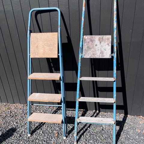 Stege med tre steg i trä och metall. Stegen har trätrappsteg och metallram, lämplig som hjälpmedel vid arbete inomhus där extra höjd behövs, till exempel vid målning, förvaring eller enklare hushållsarbete. Stegen är hopfällbar och kompakt, vilket underlättar förvaring när den inte används.