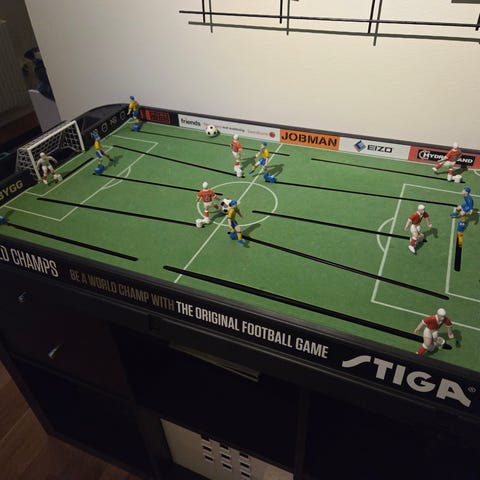 Stiga World Champs fotbollsspel med stativ. Bordsspelet har en grön spelplan med markerade linjer och två mål. Spelarna är monterade på stänger som styrs manuellt från sidorna. Modellen står på ett svart hopfällbart stativ som ger en upphöjd spelhöjd. Lämpligt som bordsspel för inomhusbruk.