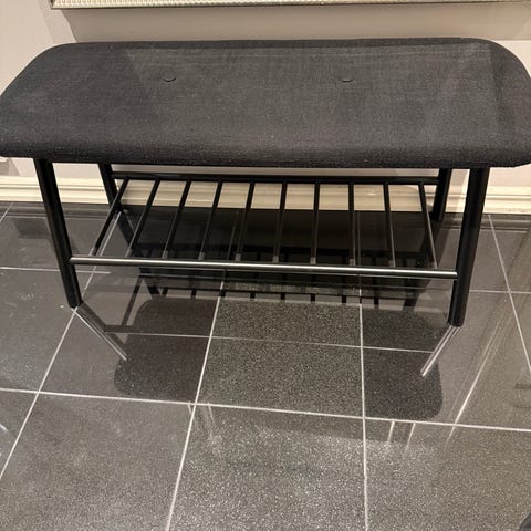 Bänk med sits och inbyggd skohylla. Sitsen är klädd i svart material och underdelen består av en stomme i svart metall med flera metallstänger för förvaring av skor. Passar till hall, entré eller andra utrymmen där sittplats och skoförvaring önskas i ett möbelstycke.