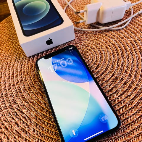 iPhone 12 mini med 64 GB lagring. Mobilen har alltid skyddats av skärmskydd och skal. Originalkartong, laddare och hörlurar ingår.
