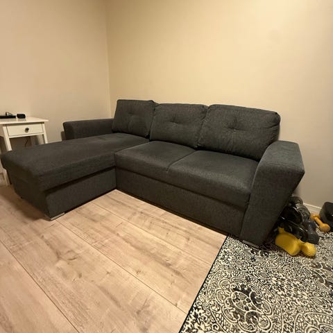 Säljer en mycket fin och stilren bäddsoffa i modern bouclé-klädsel (ljus/beige). Soffan är både bekväm att sitta i och enkel att bädda ut till säng, perfekt när man har gäster eller vill spara plats.