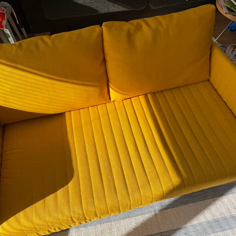 Soffa köpt för ett år sedan på IKEA för 3000 kr. Lite använd. En liten fläck syns när man fäller ut den (på det grå tyget).