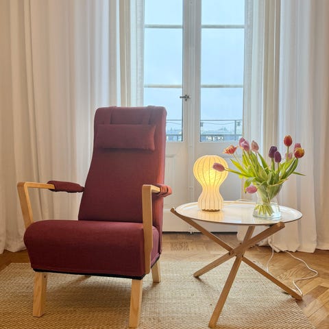 Sam Larssons sena mid century modern-fåtölj i oxblodsrött skin.