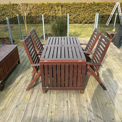 Ett ordentligt tungt robust bord utav märke Jutlandia med tillbehörande 6st konst rotting stolar med dynor, dynorna behöver dock en tvätt. Det finns ett litet märke på bordet - se bild.