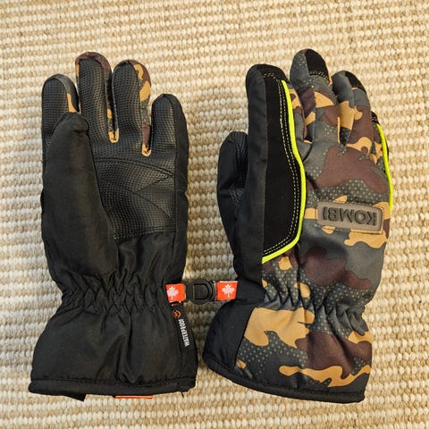 Ett par varma och vattentäta barnhandskar för Alpin skidor från Kombi med kamouflagemönster i storlek XS (passar ca 6–7 år). Nästan nya – använda bara en gång!