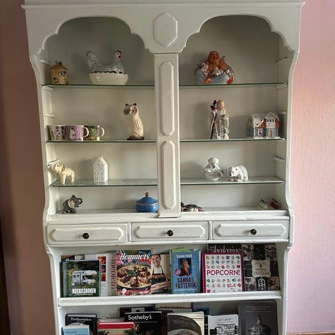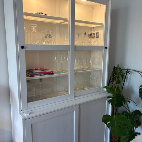 Fint rymligt och lantligt vitrinskåp inköpt i Holland. Mycket förvaring i nedre delen i kombination med vitrin med skjutdörrar.