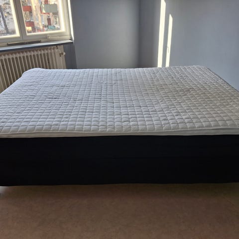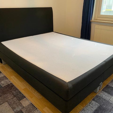 Svart Komplett kontinentalsäng 180x200 cm med tillhörande gavel. Katt har funnits I hemmet och rökfri. Mediumfast, ingen bäddmadrass
