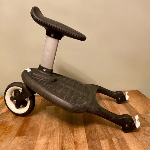 Babyzen ståbräda med sits för barnvagn. Modellen är svart och har två hjul bak samt ett fäste fram för montering på kompatibel Babyzen-vagn.