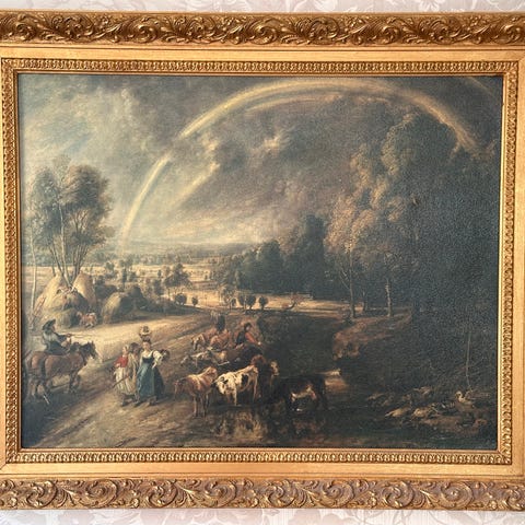 Motivet föreställer en klassisk allegorisk scen i rokoko-stil, inspirerad av franskt 1700-talsmåleri (Fragonard-stil). Bilden är målad på en porslinsplatta och monterad i en ram, vilket var en populär konstform i Europa under första hälften av 1900-talet.