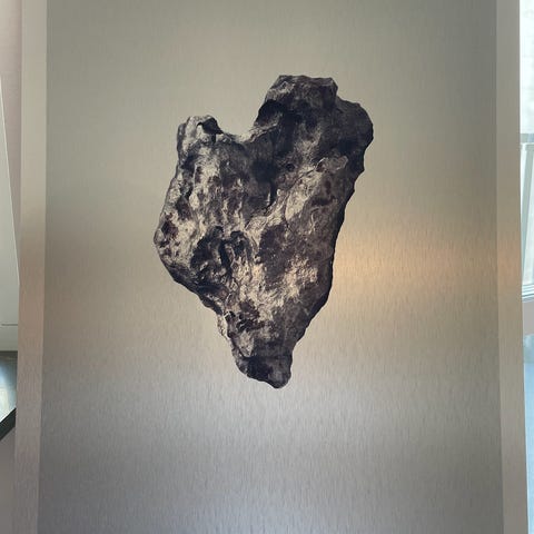 Selling a piece of art, where aluminium has been played around with instead of the classic canvas with printed image of meteorite (in gold) found in Gibeon, Namibia. Designed by Bolia Design Team. Comes with original box.