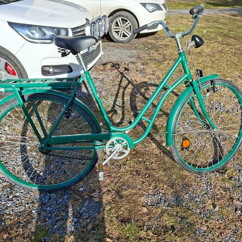 Barncykel med 24" hjul i vit och grön färg. Utrustad med pakethållare bak, kedjeskydd och stänkskärmar och stöd. Cykeln har upprätt sittställning med justerbart styre och sadel. Passar barn som behöver en något större cykel för vardagscykling till skola och fritidsaktiviteter. OBS att det är punktering på bakdäcket, därav det låga priset. I övrigt gott skick. Först till kvarn.