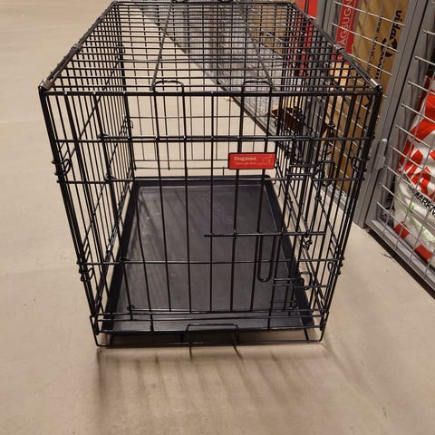 Svart metallbur för hund med plastbotten