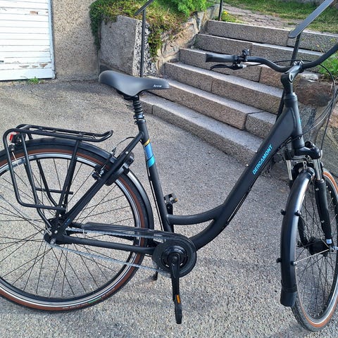 Dämpad framgaffel och sadel. 7 växlar, Shimano, handbroms fram och bak samt fotbroms.