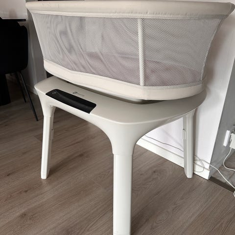 4moms vagga i vit färg. Vaggan har en oval liggyta med nätade sidor för insyn och luftgenomströmning. Stabil bas i hårdplast och madrass. Passar spädbarn under vilostunder och nattning i hemmet. Manual medföljer enligt bild.