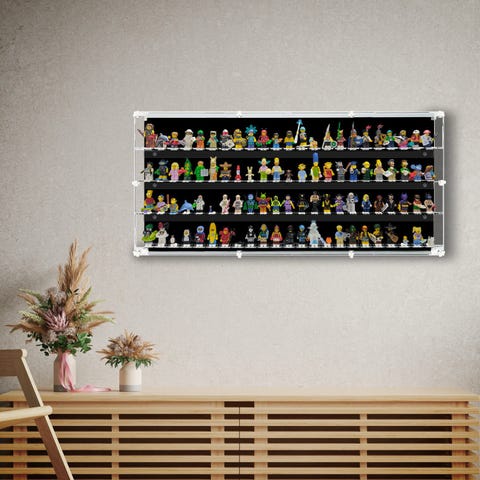 Displayställ akrylhylla för Lego minifigurer i transparent akryl med svart bakstycke. Hyllan har flera våningsplan anpassade för små figurer eller samlarobjekt. Lämplig för förvaring och visning av till exempel minifigurer, små leksaker eller samlarföremål i hem, kontor eller hobbyrum.