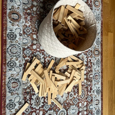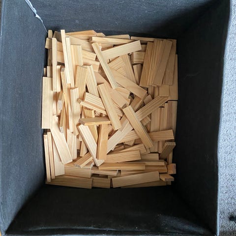 En större mängd nya och äldre kaplastavar placerade i en egenbyggd låda.