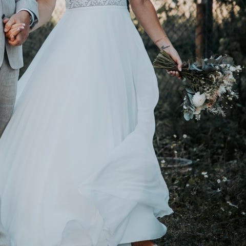 Klänningen är från Vårcollection år 2023. Och Köpt i en bröllopsaffär som även kan hjälpa till att sy ut den.