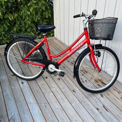 Cykel med 26" hjul i röd färg. Utrustad med framkorg och pakethållare bak. Lämplig som vardagscykel för kortare och längre turer. Passar äldre barn eller kortare vuxna beroende på längd och inställning av sadel och styre.