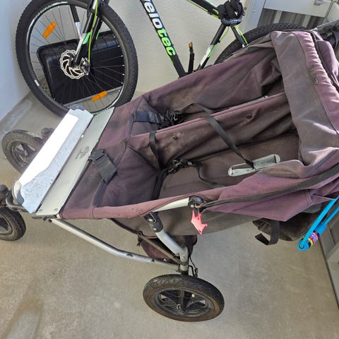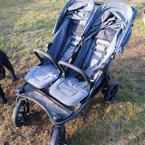 Mountain Buggy dubbel barnvagn/syskonvagn med två sittdelar bredvid varandra. Gemensam frontbygel och individuella ryggstöd och fotstöd för varje sittdel. Lätt vagn med förvaringskorg under vagnen. Ryggstöden kan fällas bakåt för sovläge. Linningen på handtaget har släppt lite. Handtaget går att fälla in. Har funkat jättebra men nu är barnen för stora. Kan fällas ihop och få plats i en baklucka på en kombi.