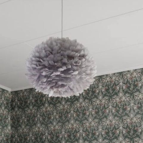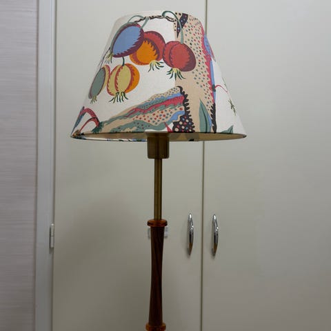 Svängbar och utdragbar arm i teak med medföljande lampskärm i tyg melodi (svart) av Stig Lindberg, 22 cm.