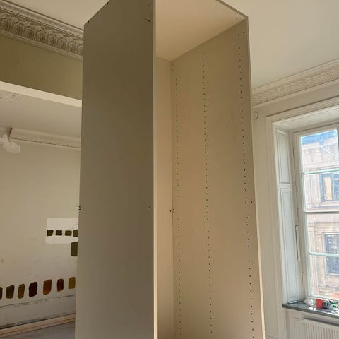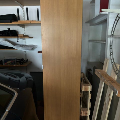 Stor trähylla. Har använts för förvaring av ritningar i A-mappar.