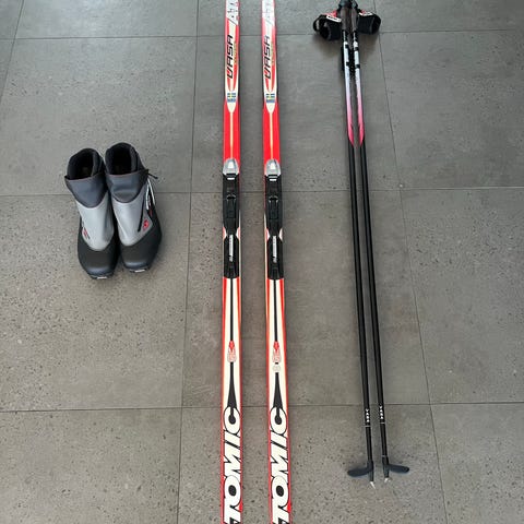 Edsbyn längdskidor 130-140cm med 100cm stavar. Pjäxor strl 33.