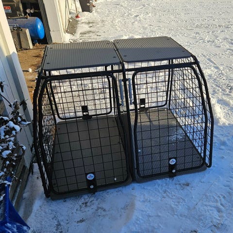 Hundbur dubbel i metall med två separata fack. Buren är svart med galler runtom och har öppningsbara dörrar fram. Botten är plan och hård för stabil placering. Lämplig för transport av två hundar i bil eller för tillfällig uppstallning hemma eller i annat utrymme.
