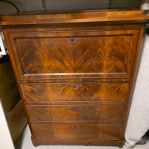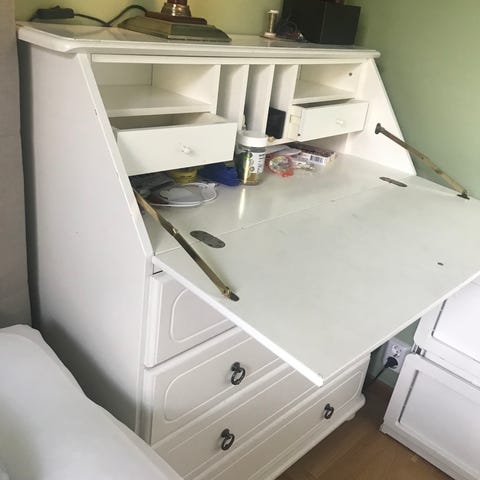 Äldre sekretär med fällbar skrivskiva och flera små lådor. Stabil möbel med fin patina. Bra förvaring och charmig detalj i hemmet eller som projekt för den som vill fräscha upp den.