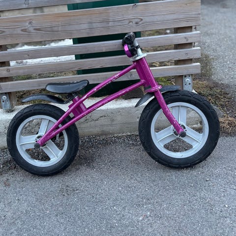 Röd spring/balanscykel. Rostig på sina ställen ( har försökt slipa bort en del rost) och blekt i färgen. Tror det är 12 tum på däcken. Funkar som den ska, rullar lätt och punkeringsfria däck. Varit en favorit till två barn. Perfekt för promenader eller till och från förskolan.