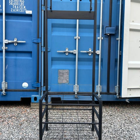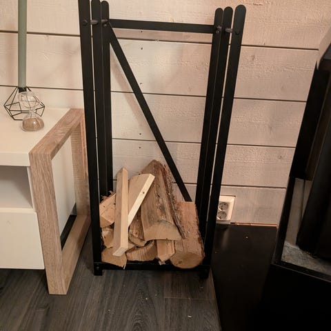 Vedställ i svart metall. Stabilt och stilrent, perfekt bredvid kamin eller eldstad.