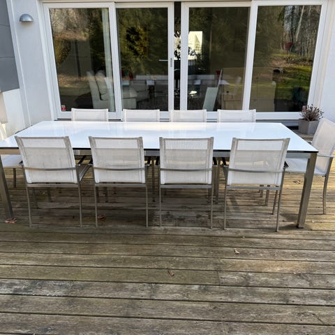 Matgrupp för utomhusbruk bestående av ett rektangulärt bord och flera stolar.