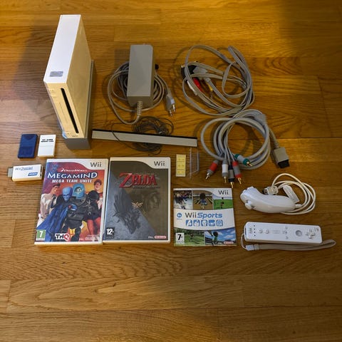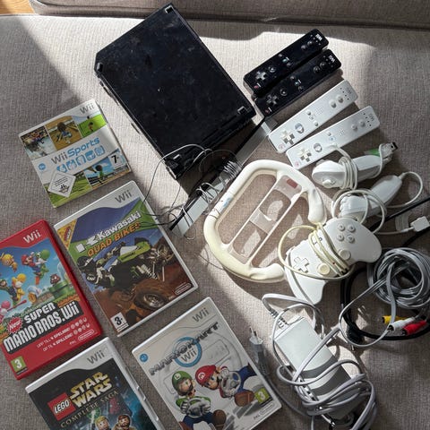 Nintendo Wii spelkonsol svart med handkontroller och rattar