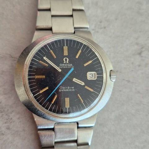 Klassisk manuell Omega i stålboett med ljus tavla och guldfärgade siffror/visare.