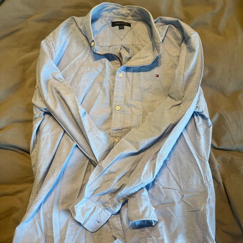 Tommy Hilfiger skjorta för herr i storlek L. Skjortan är vit och tillverkad i bomull. Klassisk modell med krage och knäppning framtill. Diskret Tommy Hilfiger-logga på bröstet och detaljer vid knappslån. Passar till vardag och mer uppklädda tillfällen. Inte använd på länge då den inte passar mig längre!