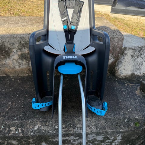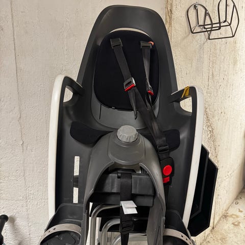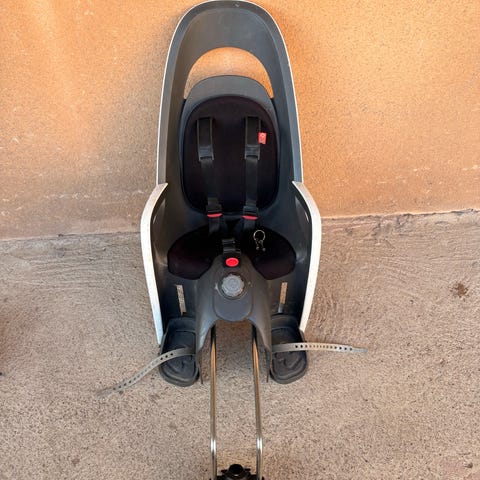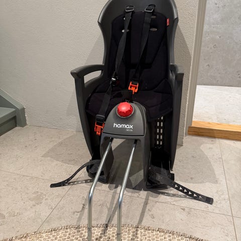 Hamax cykelsits för montering på cykel. Modellen är avsedd för barn upp till 22 kg. Sitsen är grå med svart insats och har justerbara fotstöd, trepunktsbälte och bygelarmstöd. Fästen för montering på cykelns ram ingår enligt bilderna. Lämplig för transport av ett barn på cykel på ett säkert och stabilt sätt, inom den angivna viktgränsen på 22 kg.