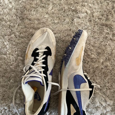 Nike spikskor i storlek 42,5. Skorna är vita med blå detaljer och har spikplatta under sulan anpassad för löpning på bana. Ovandel i lätt syntetmaterial med snörning. Yttersula med utbytbara spikar för grepp på tartanbana. Levereras med tillhörande påse med dragsko.