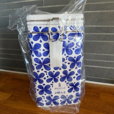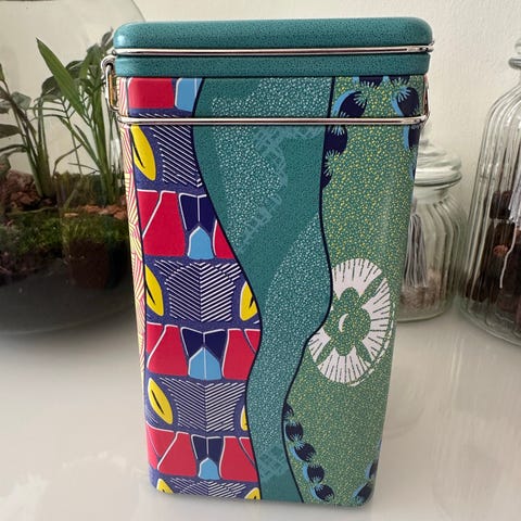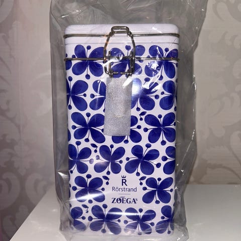 IKEA burk med lock i metall. Coffebyvomen Burken har ett färgstarkt, mönstrat yttre i flera färger och ett tätslutande lock med bygelspänne. Insidan är i omålad metall. Lämplig för förvaring av till exempel te, kaffe, kakor eller andra torra livsmedel i kök eller skafferi.hämtas på Lidingö