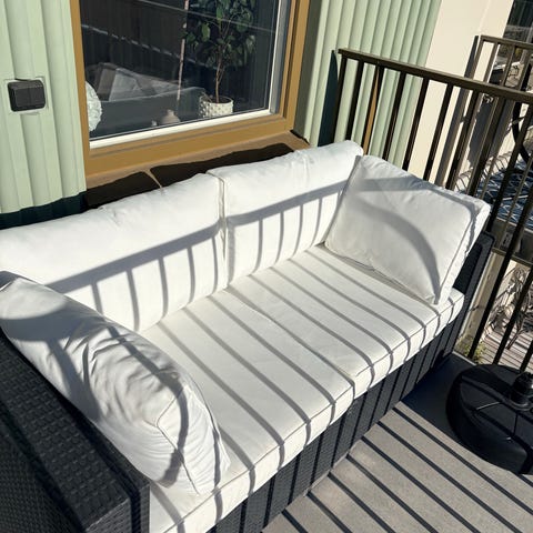 Säljer en väldigt fin och bekväm hörnsoffa för utomhusbruk. Dynorna är i beige färg och stommen är svart i en stilren flätad design. Soffan är inköpt på Mio förra sommaren men passade tyvärr inte hos oss, så den har stått förvarad i förråd sedan dess.