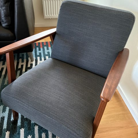 3-sits soffa med trästomme i valnötsfärg. Grått tyg utan skador eller fläckar. Skön att sitta i 🤩 Passar som sittmöbel i vardagsrum eller allrum. Har plockat isär den av utrymmesskäl, alla skruvar finns.